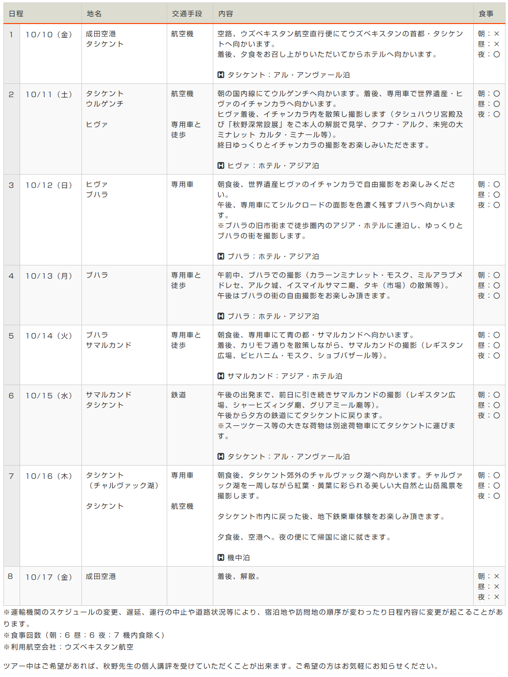 ➤ ウズベキスタンの撮影に熟知した秋野深先生監修の日程。ウズベキスタンの魅力を知っていただける被写体がギュッと詰め込まれています。