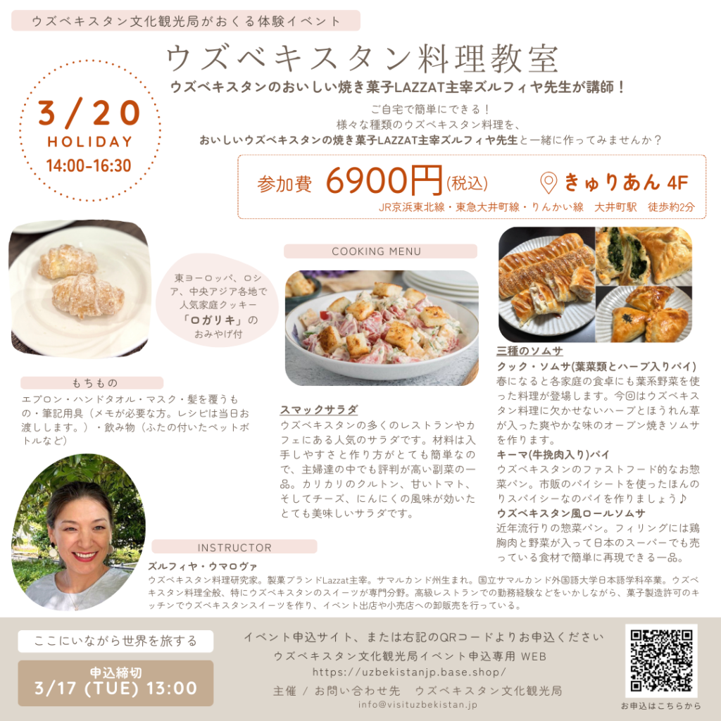 - [イベント・セミナー情報] 【3/20 東京】「ウズベキスタン料理教室」開催のご案内 NEW