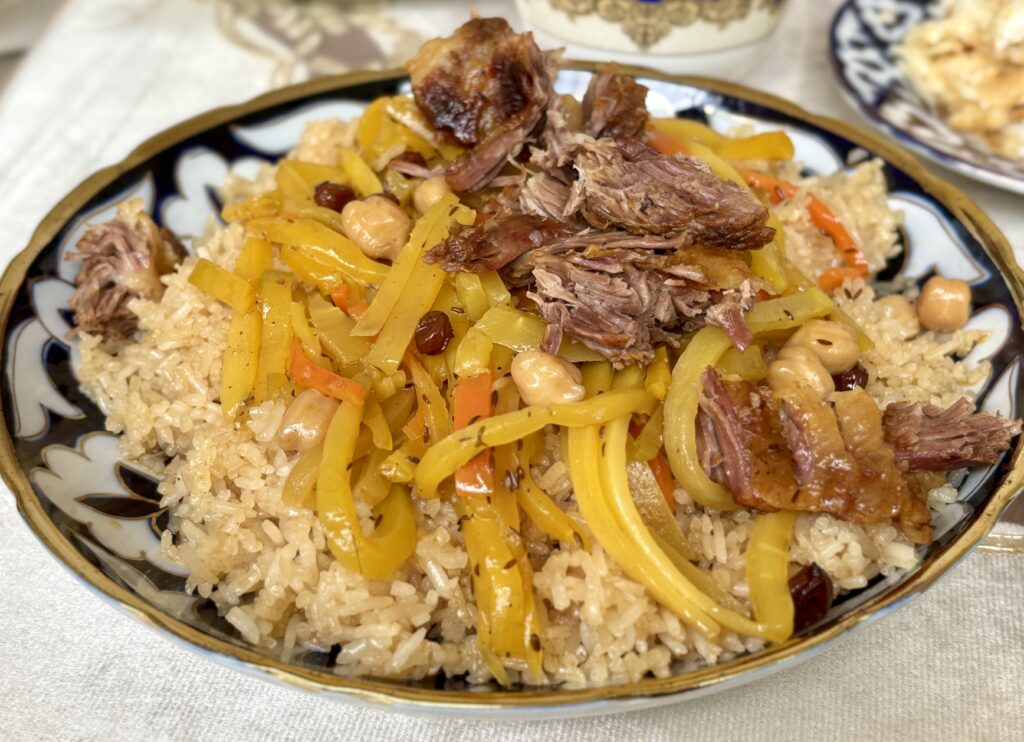 ウズベキスタンをはじめ中央アジアで広く食べられている炊き込みごはんで、ウズベキスタンの国民食であり、肉(通常は羊肉や牛肉)、ニンジン、玉ねぎ、さまざまなスパイスで調理されるご飯の料理です。よく焼いた肉としっかり炒めたにんじんの旨味をお米にたっぷり吸わせて炊き上げ、クミンのほんのりした香りが口の中に広がります。そして、しばしばレーズン、揚げたタマネギ、ウズラの卵で飾られます。